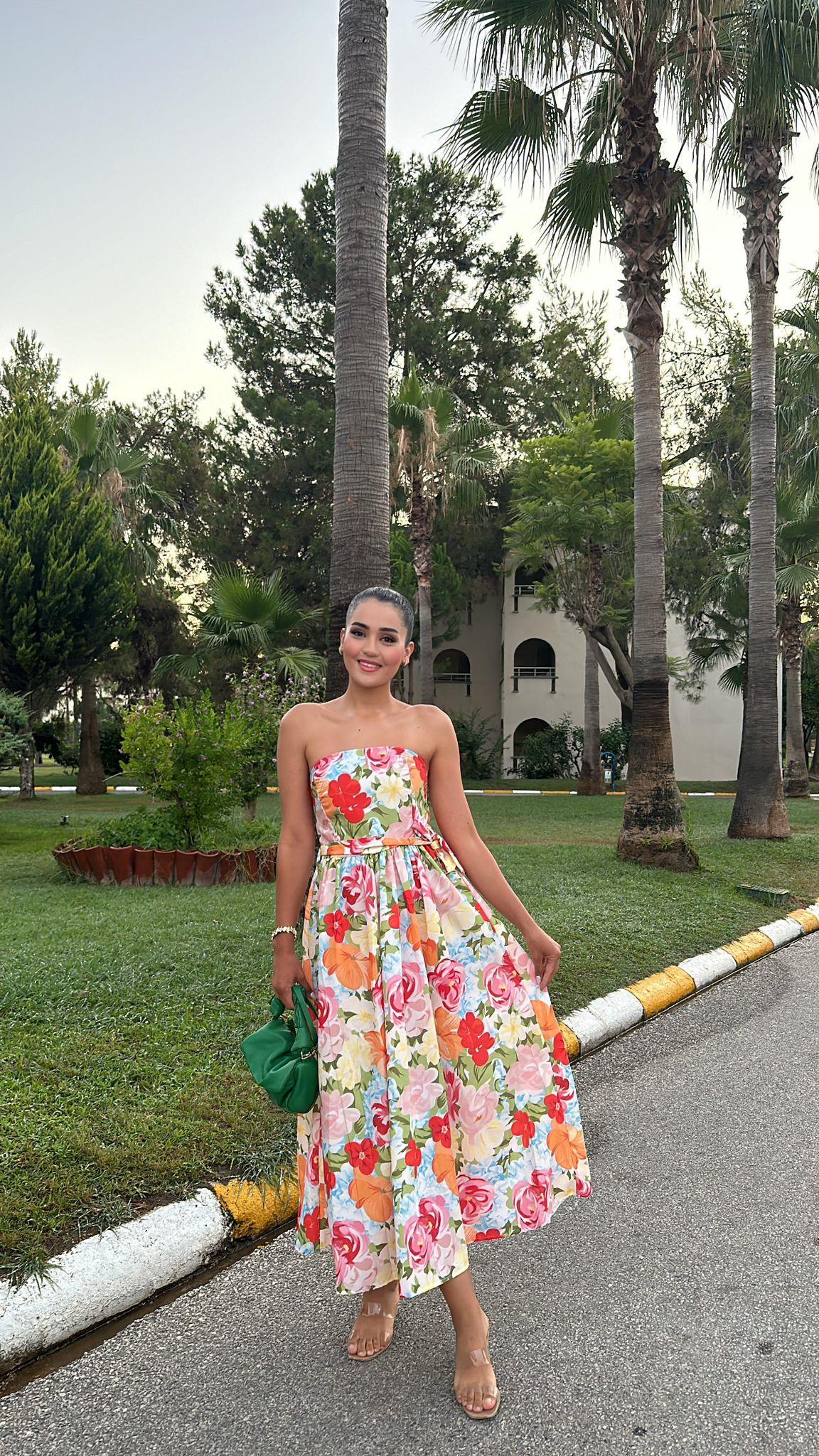 Straplez Çiçek Desenli Elbise Kırmızı